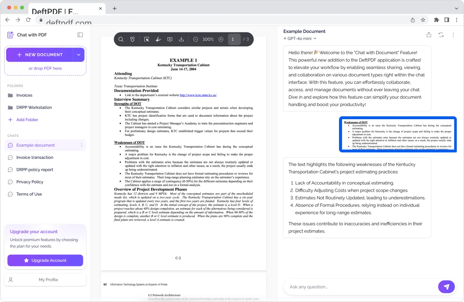 Users can upload, preview, and converse with PDFs, pinpoint regions, andexport chat history. The interface advertises GPT‑4ooptions and multi‑PDF chats, giving teams a quick way to extract insights across documents. Files are transmitted over encrypted connections and are deleted after processing.